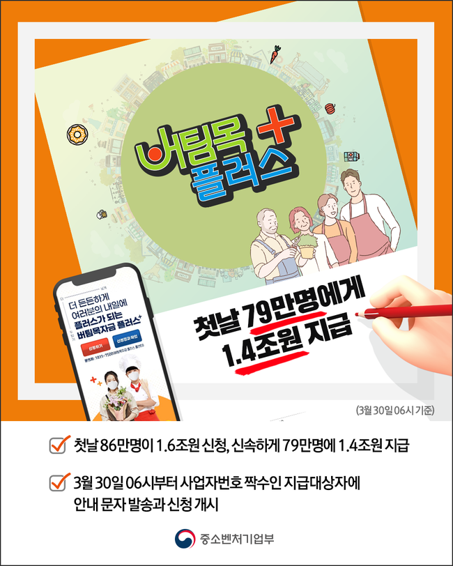 중소벤처기업부(이하 중기부)는 오늘부터 ‘버팀목자금 플러스’ 확인지급을 시행한다.