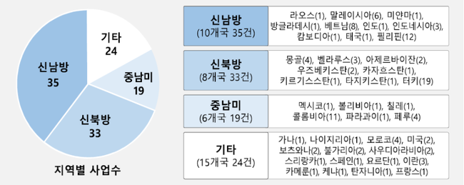 지원 국가를 보면 신남방 지역은 10개국에서 35건, 신북방 지역은 8개국에서 33건, 중남미지역은 6개국에서 19건을 제출했다. 올해 공모에는 아프리카, 중동 지역과 미국·프랑스·스페인 등 선진국이 공모에 새롭게 참여하면서 대상국의 범위가 확대됐다.