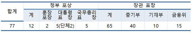 포상 훈격은 훈장, 포장, 대통령 표창, 국무총리 표창, 중소벤처기업부장관 표창, 기획재정부장관 표창, 금융위원회 위원장 표창 등 총 77점 내외다.