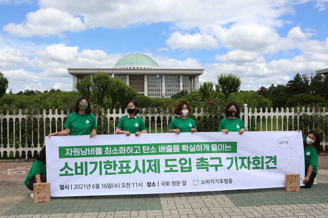 소비자기후행동, 아이쿱생협연합회, 소비자단체 등은 16일 오전 국회 정문 앞에서 `소비기한표시제 도입 촉구 기자회견`을 가졌다.