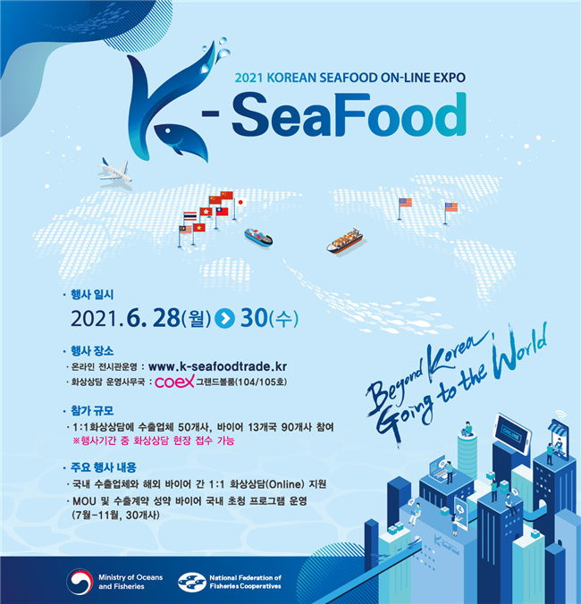 해양수산부(이하 해수부)는 국내 수산물 수출시장에 활력을 불어넣고자 비대면 온라인 수산박람회인 `2021 KOREAN SEAFOOD ON-LINE EXPO`를 28일부터 30일까지 3일간 개최한다고 밝혔다.