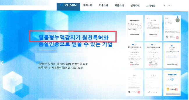유민에쓰티는 2008년 12월부터 2021년 6월 심의일 현재까지 자신의 홈페이지를 통해 필름형누액감지기에 대해 원천특허를 갖고 있다고 광고했다.