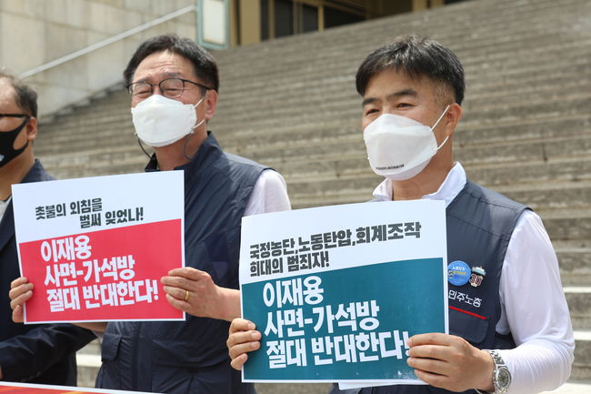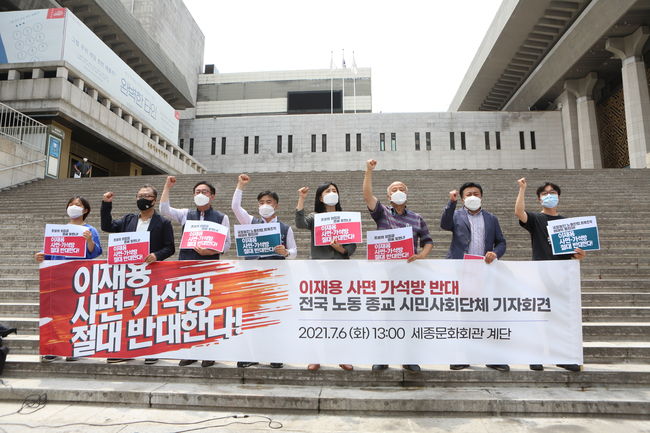 참여연대, 한국진보연대 등 노동·인권·시민사회단체들이 6일 오후 서울 세종대로 세종문화회관 앞에서 기자회견을 열고 이재용 삼성전자 부회장의 사면·가석방 반대를 주장했다.