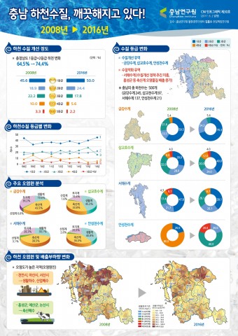 2일 충남연구원은 도내 하천 수질(2008년, 2016년)을 비교 분석한 인포그래픽을 통해 지난해 기준 1·2등급 하천은 74.4%로 2008년 64.5%에 비해 약 10% 늘어났다고 밝혔다. 이는 충남도의 지속적인 물통합관리정책에 따른 모니터링과 수질 개선 노력으로 오염원이 줄었기 때문이라고 설명했다.