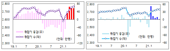 산업별로는 보건업 및 사회복지서비스업에서 20만 8000명으로 8.7%, 건설업에서 14만명으로 7.0%, 운수 및 창고업에서 8만 9000명으로 6.0% 증가했다. 코로나19 영향으로 도매 및 소매업은 4.7% 감소했고 협회 및 단체·수리 및 기타개인서비스업 또한 4.6% 감소, 예술·스포츠 및 여가관련 서비스업도 8.3% 감소했다.
