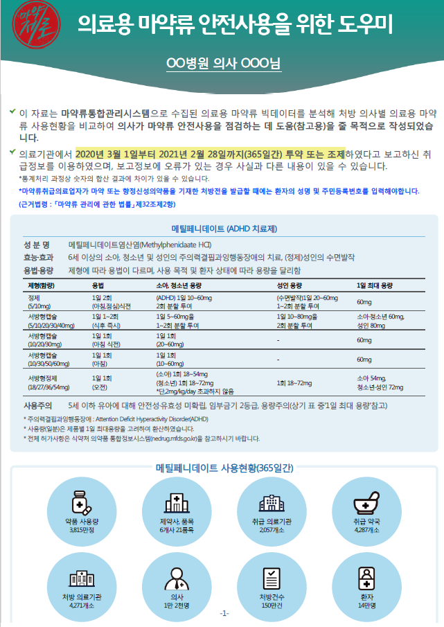 안전사용 도우미 서한의 내용은 의료용 마약류 ADHD치료제 `메틸페니데이트` 현황에 대한 통계 분석 자료를 바탕으로 작성됐다.
