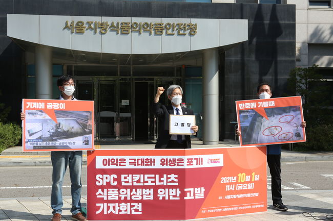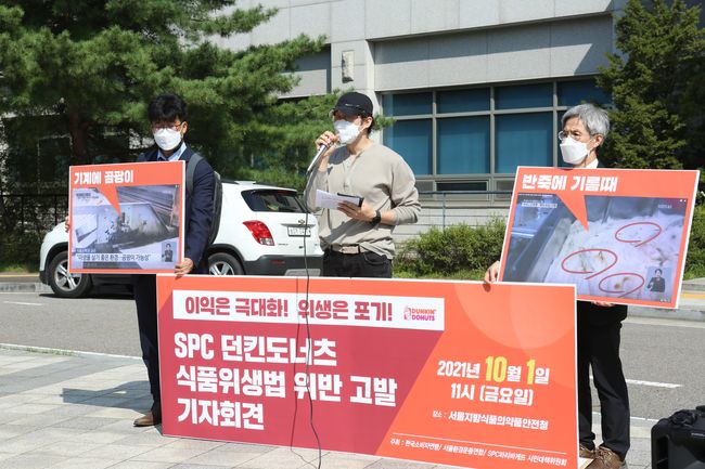 서울환경운동연합 등 3개의 시민단체는 1일 서울식약청 앞에서 `SPC 던킨도너츠 식품위생법 위반 고발 기자회견`을 열고 비위생 공정 논란이 제기된 SPC 던킨도너츠를 식품위생법 위반 혐의로 고발했다고 밝혔다.
