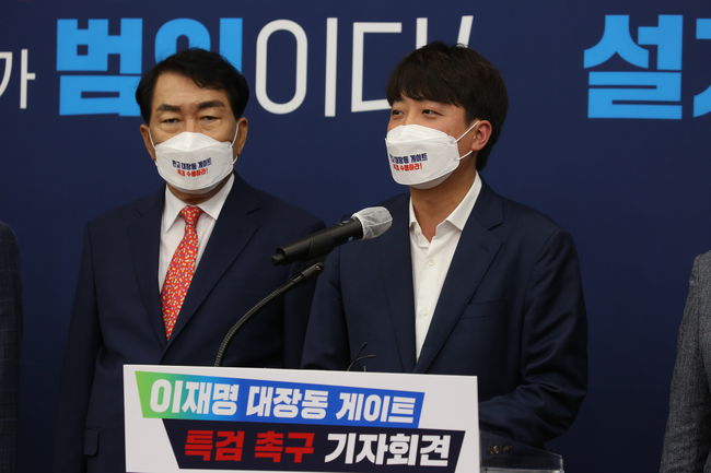 이준석 당대표는 이날 국회에서 `이재명 대장동 게이트 특검 촉구 기자회견`을 개최했다. 당내 대권 주자들인 윤석열 전 검찰총장, 유승민 전 의원, 최재형 전 감사원장 등도 참석해 특검 도입에 힘을 실었다.