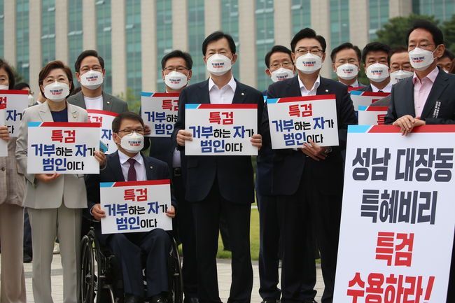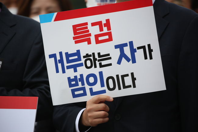 출정식에 참석한 의원이 이재명 경기도지사의 특검을 촉구하는 피켓을 들고 있다. 국민의힘은 8일 대장동 게이트 특검 추진을 위한 천막투쟁에 나섰다. 참석자 전원 왼쪽 가슴에 근조 리본을 달고 특검수용을 한목소리로 외쳤다. 국민의힘 의원 60여명은 이날 오전 9시 국회 본관 앞 계단에서 대장동 게이트 특검 추진 천막투쟁본부 출정식을 개최했다.