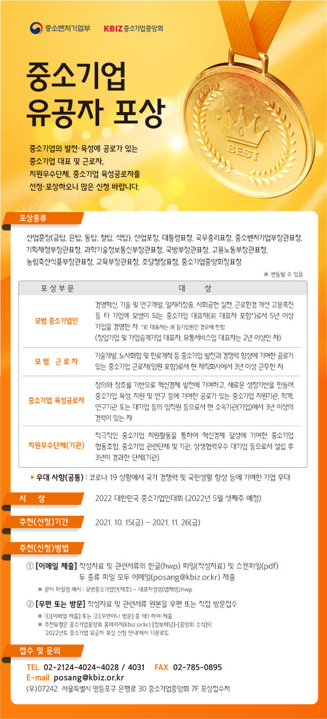 중소벤처기업부(이하 중기부)는 15일부터 11월 26일까지 중소기업 발전과 육성에 기여한 공로자를 발굴‧포상하기 위해 `2022년 중소기업 유공자 포상` 신청을 받는다고 밝혔다.