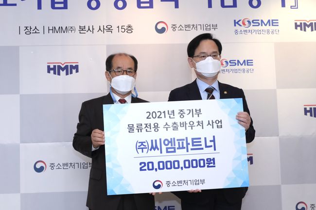이날 행사에 참석한 중기부 강성천 차관은 에이치엠엠의 상생협력에 대한 공로를 기념하는 감사패 전달과 함께 물류전용 수출바우사업 지원기업 4개사에 바우처 수여식을 진행했다.