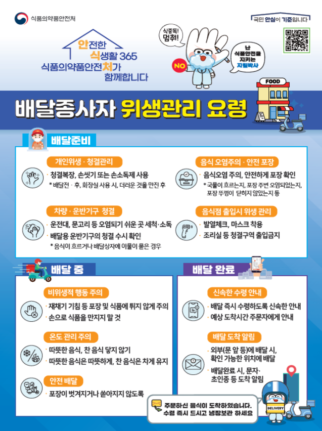 주요 내용은 ▲조리음식점의 조리 전‧후 안전관리와 포장단계 안전관리 ▲배달과정에서의 위생‧안전관리 ▲주문고객의 음식 섭취 후 보관 등 주의사항 등이다.