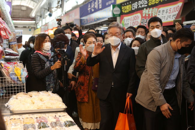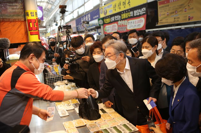 이재명 더불어민주당 대선 후보는 27일 본격 대선 행보에 나섰다. 이날 그는 서울시 관악구 신원시장을 방문, `민생 행보` 첫 걸음을 내딛었다.