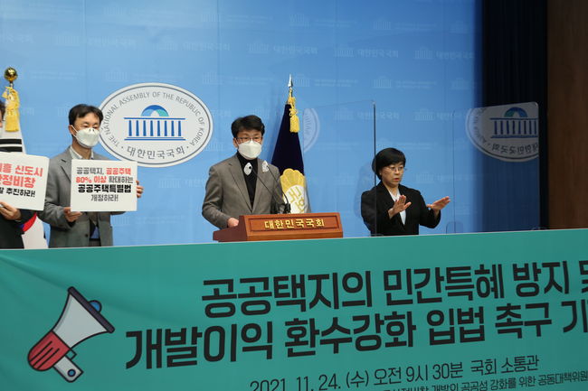 이들은 이번 정기국회에서 토지의 공공성 확보를 위해 공공택지의 공공주택 비율을 확대하는 `공공주택특별법`, 주택 공영개발지구를 지정하는 `주택법`, 개발이익 환수와 민간사업자의 과도한 이윤을 제한하는 `개발이익환수법`, `도시개발법` 등 대장동 방지 4법의 신속한 상정과 처리를 촉구했다.
