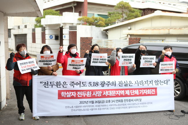 민주노총 서울본부 서부지역지부, 서대문겨레하나 등 단체들은 26일 서울 서대문구 연희동 제11·12대 대통령을 지낸 전두환 사저 앞에서 `전두환은 죽어도 5.18 광주의 진실은 사라지지 않는다` 기자회견을 열고 "전두환이 사망했다 해도, 당시 발포 명령을 내렸던 신군부 수장 전두환에 대한 처벌은 계속돼야 하고, 추징금도 유가족들이 지급해야 한다"고 강조했다.