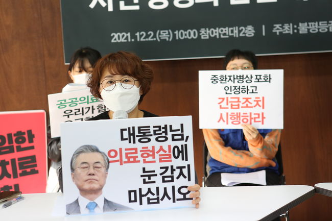 시민사회단체는 "일일 확진자가 5000명이 넘어가는 이 시기에 정부는 11월 29일 `코로나19 단계적 일상 회복에 따른 의료 및 방역 후속 대응계획`을 발표했지만 병상과 인력 확보 방안은 전혀 내놓지 않고, 확진자가 필요한 경우에만 입원 치료를 받는 재택치료 중심으로 전환하겠다고 밝혔다"며 "코로나19 확진자 급증으로 병상이 남지 않자 정부가 입원 대기자가 많은 현실을 은폐하려는 것으로 밖에 볼 수 없다"고 주장했다.