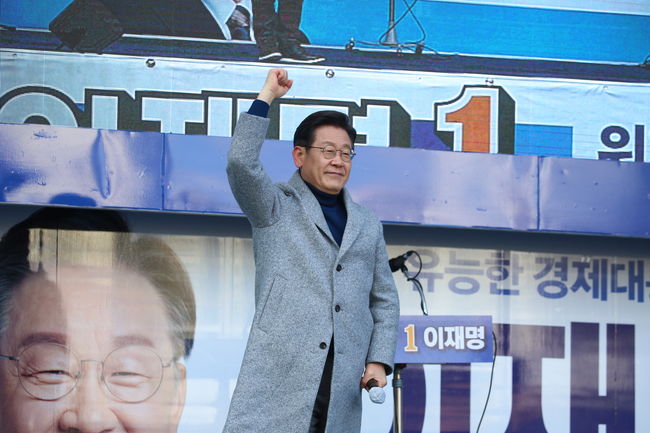 이재명 더불어민주당 대선 후보가 22일 인천 부평역 앞 광장에서 `인천 재도약 앞으로, 인천 경제 제대로!` 부평 유세를 펼쳤다.