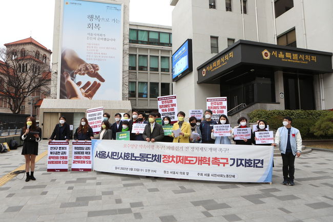 서울 시민사회노동단체 회원들은 23일 오전 서울 중구 서울시의회 앞에서 정치제도개혁 촉구 기자회견을 가졌다.