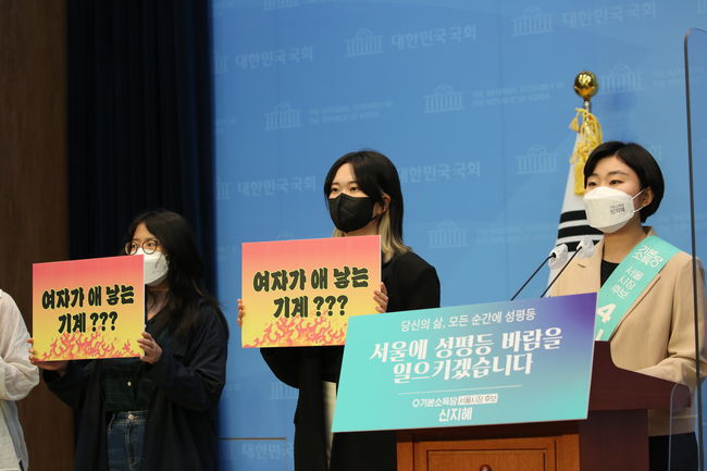 기본소득당 신지혜 서울시장 후보는 9일 서울 여의도 국회 소통관에서 서울시장 선거 공약발표 기자회견을 가졌다. 이날 신 후보자는 `서울에 부는 당신의 바람 신지혜가 일으키겠습니다`의 세 번째 순서인 `서울에 성평등 바람을 일으키겠습니다`를 주제로 공약 발표에 나섰다.