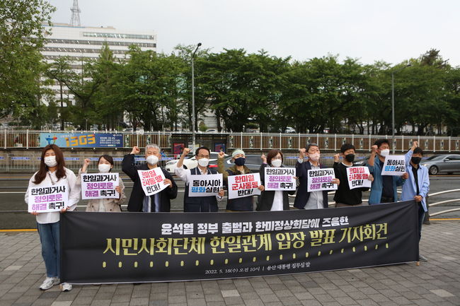 정의기억연대 등 시민사회단체들이 18일 서울 용산 대통령 집무실 앞에서 윤석열 정부에 한일 과거사 문제 해결을 촉구하는 기자회견을 진행했다. 시민사회단체들은 윤석열 정부가 한일과거사 문제의 원칙적 해결에 나설 것을 요구하면서 “윤 대통령은 취임 전부터 한일정책협의단을 파견하는 등 한일관계 개선 의지를 강하게 피력했으나, 이것이 이른바 한일관계의 ‘포괄적 접근’, ‘그랜드바겐’이 조만간 이뤄지는 것이 아니냐는 우려로 비춰지고 있다”고 밝혔다.