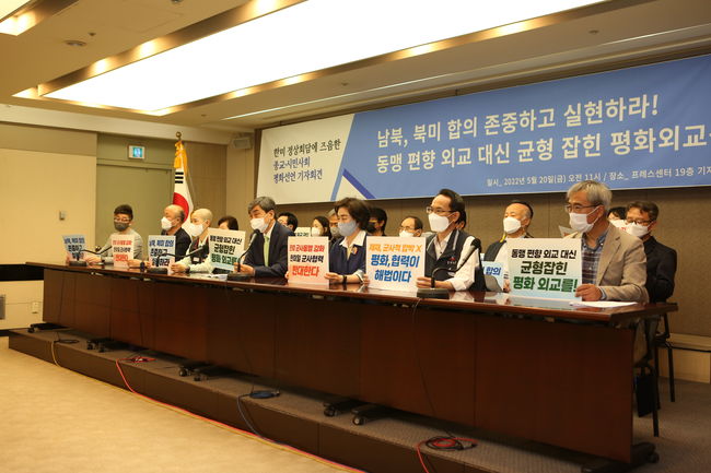 한미정상회담을 앞두고 종교 · 시민단체들은 20일 서울 중구 한국프레스센터에서 `한미 정상회담에 즈음한 종교 · 시민사회 평화선언 기자회견`을 진행했다. 기자회견에서 이 단체들은 새 정부에 균형 잡힌 평화 외교 정책 실현을 촉구하면서 이번 한미정상회담에서 대북 억제와 인도·태평양 전략 등 의제를 다루는 만큼 외교적으로 중요한 시기라는 점을 강조했다.