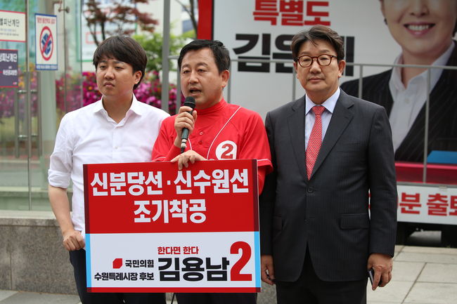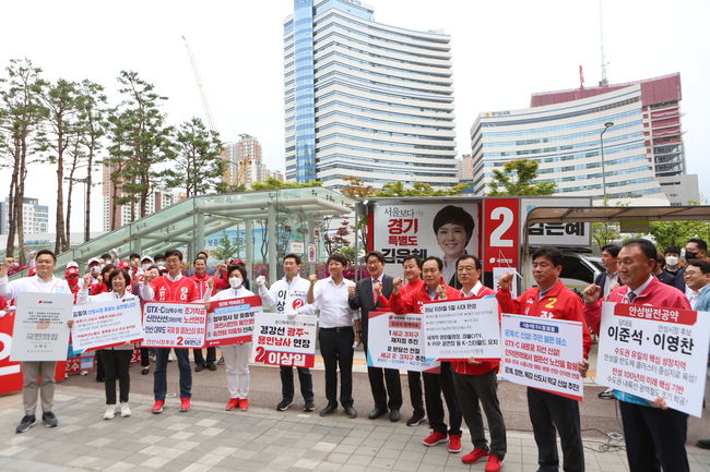 이준석 국민의힘 대표와 권성동 원내대표 겸 공동선대위원장 및 국민의힘 경기지역 지자체장 후보들이 30일 오후 경기도 수원시 영통구 경기도청 신청사 앞에서 `경기 남부권 기초단체장 후보 공약 실천 약속` 기자회견을 가졌다. 이들은 이번 6.1지방선거에서 국민의힘 필승을 외치며 경기지역 주민들에게 지지를 호소했다.