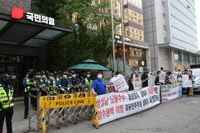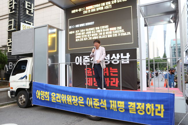 이준석 대표 성상납 관련 윤리위가 열리는 시간에 국민의힘 당사 앞에서는 시민단체 관계자들이 이 대표의 책임 사퇴를 요구하는 시위를 벌였다. 2013년 한 중소기업 대표로부터 성 상납을 받았다는 의혹이 지난해 말 제기됐고, 측근인 김철근 당대표 정무실장이 제보자에게 7억 원 상당의 투자유치 각서를 써주며 증거를 없애려 했다는 의혹이 추가로 제기됐다.