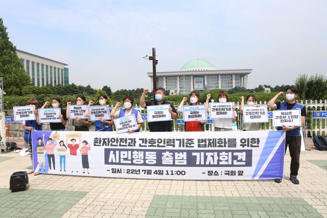 `환자 안전과 간호인력기준 법제화를 위한 시민행동`은 4일 국회 앞에서 기자회견을 갖고 간호사 1인당 담당 환자 수를 줄이는 `간호인력인권법(간호인력 인권 향상을 위한 법률)` 제정을 촉구했다.