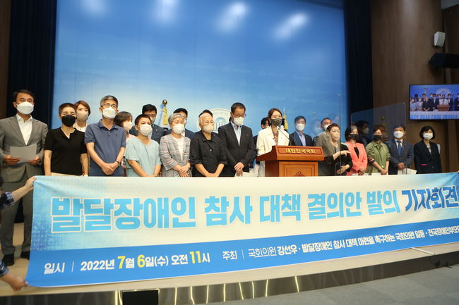 더불어민주당 강선우 의원은 6일 전국장애인부모연대와 국회 소통관에서 `발달장애인 참사 대책 결의안 발의` 기자회견을 개최했다. 기자회견에서 강 의원은 "최근 극심한 생활고와 자녀 양육 부담 등으로 발달장애 가정의 극단적 선택이 끊임없이 발생했다"라며 "5년간 언론에 보도된 발달장애인 가족 자녀 살해 후 자살 사건 등은 30여건에 달한다"고 밝혔다.