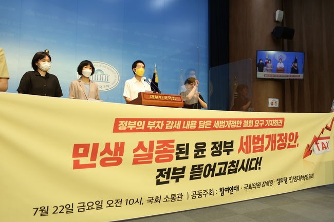 정의당 장혜영 의원은 22일 국회 소통관에서 기자회견을 갖고 전날 발표한 정부의 세법개정안에 대해 `대기업 · 고액 자산가 종합 감세 선물세트에 가깝다`고 비판했다. 장 의원은 “국정과제 이행에 필요한 209조 원에 달하는 재원을 마련할 방안도, 재정전략회의에서 강조한 건전재정을 달성할 수단도 전혀 담겨있지 않다. 불평등과 기후 위기에 대응할 중·장기적 대안도 없다. 지금 우리는 복합적 위기에 직면하고 있다. 감세를 통한 성장의 선순환이라는 환상을 좇을 때가 아니라 위기 극복을 위한 재원 마련에 나서야 할 때다”라고 주장했다.