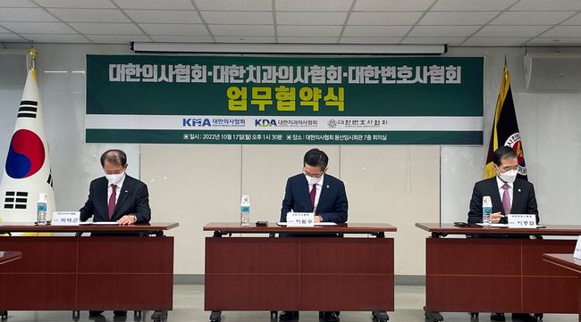 대한의사협회(회장 이필수)는 17일 오후 대한치과의사협회(회장 박태근) 및 대한변호사협회(협회장 이종엽)와 업무협약을 체결했다고 밝혔다.