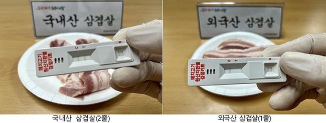 돼지고기 원산지 신속 검정키트는 2021년 국립농산물품질관리원에서 개발한 검사도구로, 10분 내에 돼지고기 원산지 판별이 가능하다. 국내산 돼지는 백신접종으로 돼지열병 항체를 보유하고 있어 키트에 2줄로 표시되고, 항체가 없는 외국산 돼지는 1줄로 표시된다.