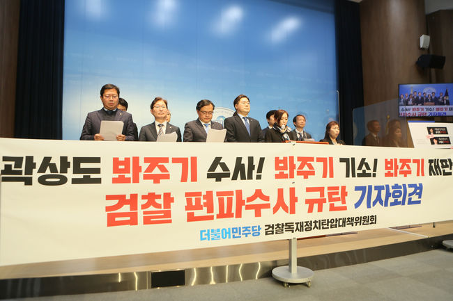 더불어민주당 검찰독재정치탄압대책위원회 소속 의원들이 10일 서울 여의도 국회 소통관에서 검찰 편파수사 규탄 기자회견을 통해 "지난 2월 7일 곽상도 50억 사건 선고일은 `모든 국민은 법 앞에 평등하다`는 헌법 원칙이 무너진 날이자 `유검무죄 무검유죄`가 다시 한 번 증명된 날이다"라고 강조했다.