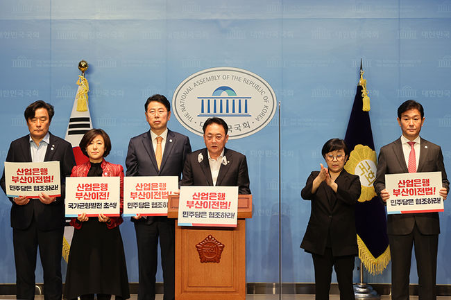 5일 오후 국회 소통관에서 열린 `산업은행 부산 이전 관련 기자회견`에서 국힘 부산시당은 "산업은행은 지난달 27일, 이전 공공기관 지정안을 금융위원회에 제출하면서 윤석열 정부의 국정과제인 본사 부산 이전을 위한 첫 단계를 내딛었다"고 평가했다.
