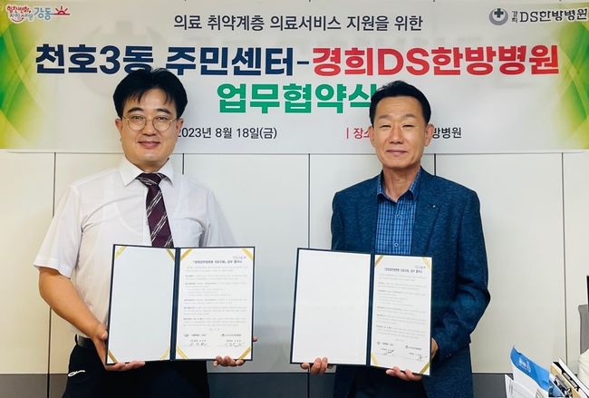그동안 천호3동에는 허리 및 무릎 통증, 영양부족 등으로 치료가 시급하지만 경제적인 부담 때문에 추나요법, 영양수액 등의 비급여 진료를 받지 못하는 저소득층 대상자들이 많았다. 이에 동은 경희DS한방병원과 의료지원 협약을 체결하여 저소득 계층을 대상으로 기본 진료 외 침 치료, 추나요법, 통증치료, 영양수액 등 통원 치료를 제공한다. 또한 사전 검진을 통해 장기간의 집중치료가 필요한 대상자에게는 입원치료도 지원하는 등 맞춤형 의료 지원을 시행한다.
