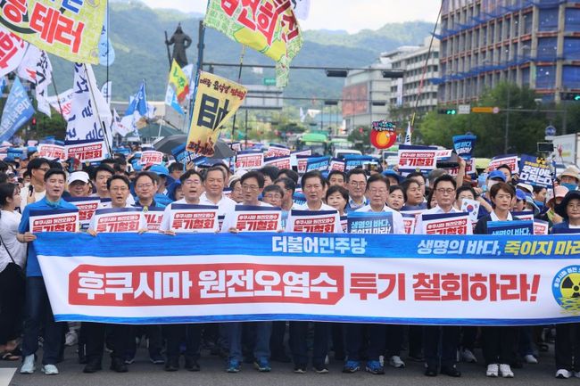 더불어민주당이 25일 일본의 후쿠시마 원전오염수 투기 중단 촉구 행진에 나섰다.