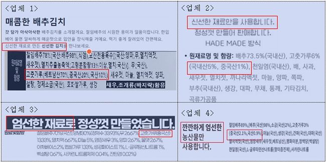 실제로 주요 온라인 쇼핑몰에서 판매되는 김치를 살펴보면, ‘깐깐하게 엄선한 농산물만 사용’, ‘신선한 재료만을 사용’ 등 국내산 농산물만 쓰는 것처럼 소비자가 오인할 수 있는 표현을 쓰면서도 고춧가루는 수입산을 사용하는 것을 쉽게 확인할 수 있었다.