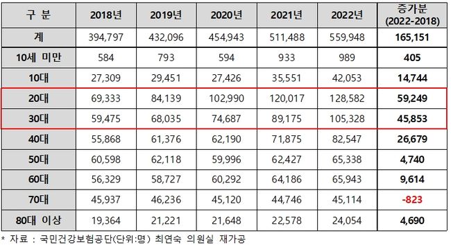 연도별 전체 초진 환자 수 대비 2030 환자 수를 보면 2018년 394,717명 중 128,808명(32.6%), 2019년 432,096명 중 152,174명(35.2%), 2020년 454,943명 중 177,677명(39.1%), 2021년 511,488명 중 209,192명(40.9%), 2022년 559,948명 중 233,910명(41.8%)으로 환자 수와 더불어 차지하는 비중 역시 매년 꾸준히 증가했다.