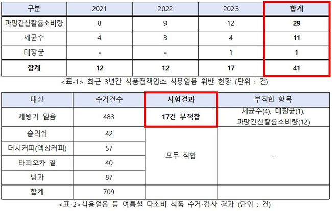 국회 보건복지위원회 국민의힘 서정숙 국회의원이 식품의약품안전처로부터 제출받은 최근 3년간 식음료 프랜차이즈 식용얼음 위생 기준 위반 적발 현황에 따르면 2021년 12건, 2022년 12건 그리고 올해 17건 등 총 41건이 기준을 위반한 것으로 집계됐다.