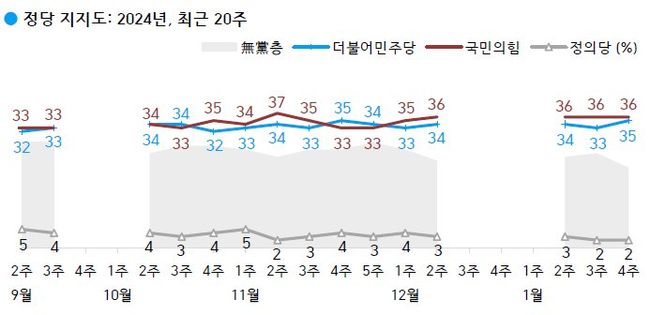 정당 지지도: 국민의힘 36%, 더불어민주당 35%, 무당(無黨)층 22% 2024년 1월 넷째 주(23~25일) 현재 지지하는 정당은 국민의힘 36%, 더불어민주당 35%, 정의당 2%, 기타 정당/단체 5%, 지지하는 정당 없는 무당(無黨)층 22%다.