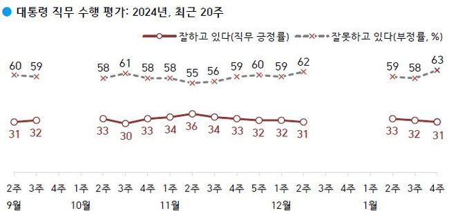 한국갤럽이 2024년 1월 넷째 주(23~25일) 전국 만 18세 이상 유권자 1,001명에게 윤석열 대통령이 현재 대통령으로서의 직무를 잘 수행하고 있다고 보는지 잘못 수행하고 있다고 보는지 물은 결과, 31%가 긍정 평가했고 63%는 부정 평가했으며 그 외는 의견을 유보했다.