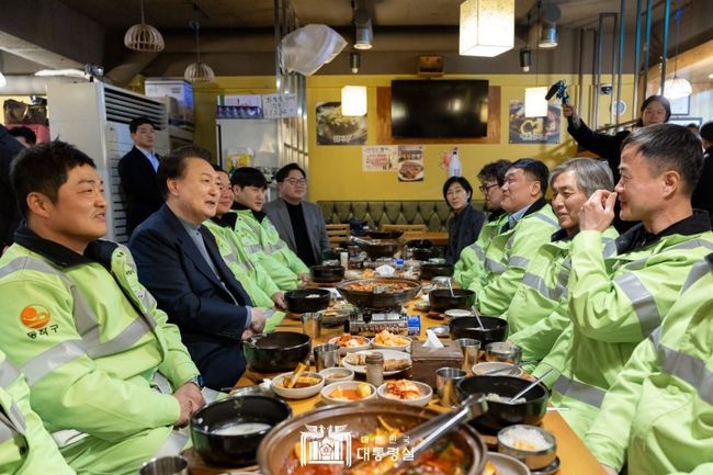 윤석열 대통령은 설 연휴 첫날인 지난 9일 서울 동작구 한 식당에서 연휴에도 거리 청소와 폐기물 수거 등 사회에 꼭 필요한 일을 묵묵히 수행하고 있는 환경공무관들과 조찬을 함께 하고 노고에 감사를 전했다.