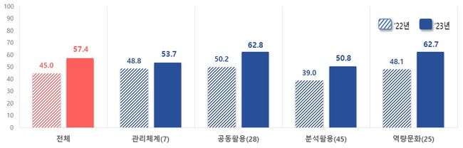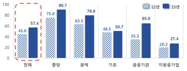 2023년 실태점검 결과를 기관 유형별로 살펴보면, 중앙행정기관을 비롯한 모든 유형의 기관이 지난해 대비 수준이 향상되었으며, 평균점수는 12.4점 상승한 57.4점으로 확인되었다.