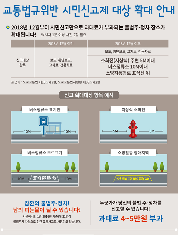 신고대상 확대는 도로교통법 개정으로 8월 10일부터 시행된 소방시설 주변 불법주정차 금지와 그간 시민들의 자발적 요청이 많았던 버스정류소 주변 불법주정차 방지를 위한 것이다. 실제로 서울시 온라인여론조사 결과 신고대상 확대에 80% 이상의 시민이 찬성하는 것으로 나타났다.