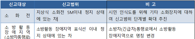 하지만 법 개정 내용을 모르는 시민들이 많아 시민신고 대상은 여러 소방시설 중 ‘지상식 소화전’에 한정한 후 추후 홍보를 병행해가며 단계적으로 대상을 확대할 계획이다. 소방차 통행로(소방활동장애지역) 주정차도 시민신고대상에 포함된다.