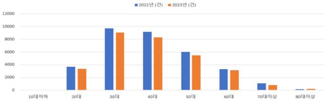 연령대 확인이 가능한 30,434건 중 30대가 9,072건(29.8%)으로 가장 많았고 40대(8,310건, 27.3%), 50대(5,476건, 18.0%) 등의 순서로 나타났다. 전연령대 상담 건수가 감소한 반면, 80대 이상의 상담이 전년대비 9.3% 증가했다.