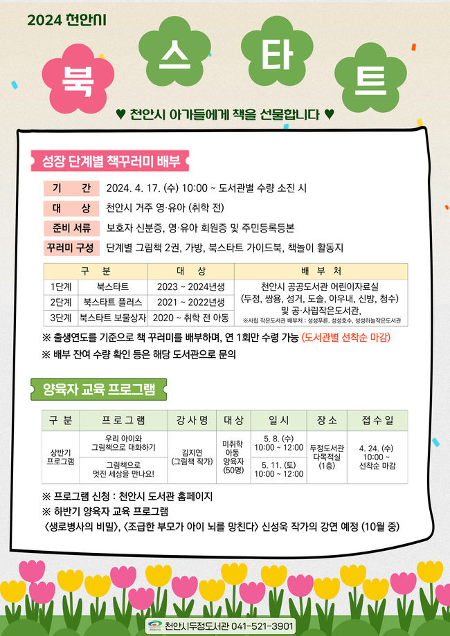 책꾸러미 배부 및 양육자 교육 프로그램 상세 내용은 천안시도서관 누리집을 참고하거나 두정도서관팀으로 문의하면 된다.