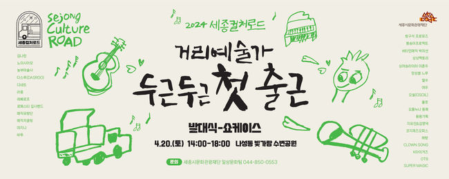 세종거리예술가와 함께하는 세종컬처로드는 4월부터 11월까지 세종시 17개 지역에서 진행되는데, 읍·면·동으로 찾아가는 공연과 이응다리, 도시상징광장 등 거리 활력을 위한 공연이 개최될 예정이다.