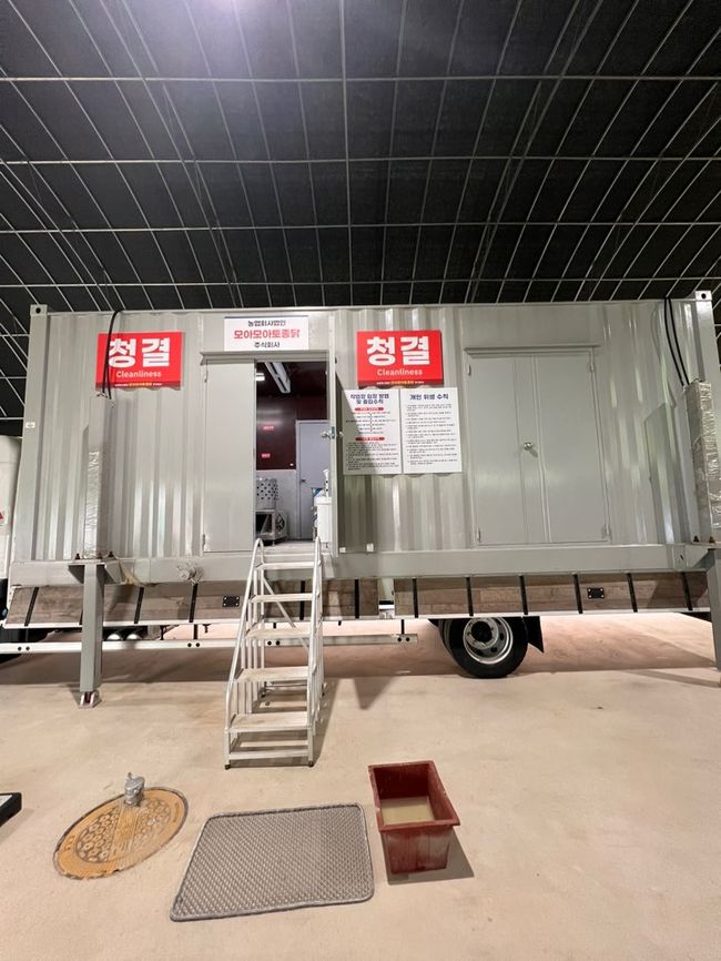 해당 시설은 5톤 트럭을 활용한 차량형 이동식 도계장으로 방혈기·탕적기·탈모기 등 도계 관련 장비 35종 42대를 탑재했으며, 하루에 500수 도축이 가능하도록 제작됐다.