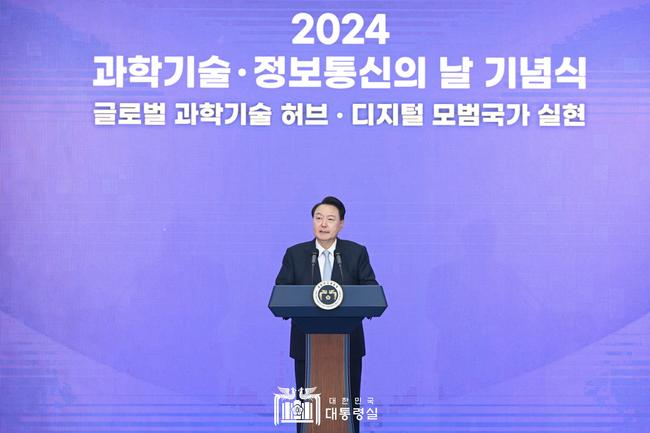 윤석열 대통령은 22일 오후 경기도 과천 국립과천과학관에서 개최된 `2024년 과학기술·정보통신의 날`에 참석했다. 대통령이 과학기술·정보통신의 날에 참석한 것은 2016년 박근혜 前 대통령 참석 이후 8년만이다.
